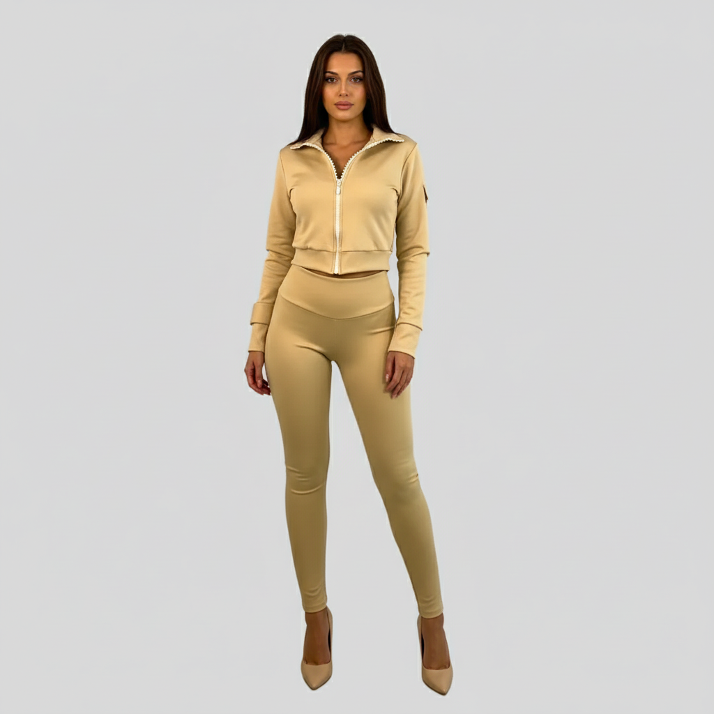 Osećajte se samouvereno i moderno u svakom trenutku sa Tia Lorens Beige Allure kompletom. Bez obzira da li idete na trening, u šetnju ili na večernji izlazak, ovaj komplet će vam pružiti eleganciju i udobnost, prilagodljiv za svaku priliku.
