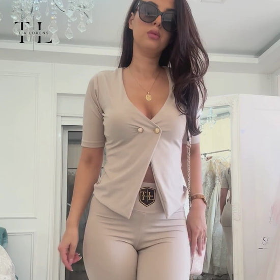 Gornji deo sa dubljim V izrezom i ukrasnim dugmićima na sredini suptilno ističe dekolte i daje modelu prepoznatljiv kouture karakter, dok produžen peplum kroj prati liniju struka i vizuelno izdužuje figuru. Donji deo su helanke visokog struka koje savršeno prijanjaju uz nogu i produžavaju siluetu, a zlatni logo detalj na struku zaokružuje luksuzan utisak. Ceo set je ručno rađen, sa posebnom pažnjom na kroj i završnu obradu.