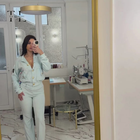 Gornji deo krase elegantni zlatni detalji i funkcionalni džepovi, dok pantalone imaju moderan, ženstven kroj koji pruža maksimalnu udobnost tokom celog dana. Bebi plava boja daje ovom setu poseban, sofisticiran i nežan izgled.