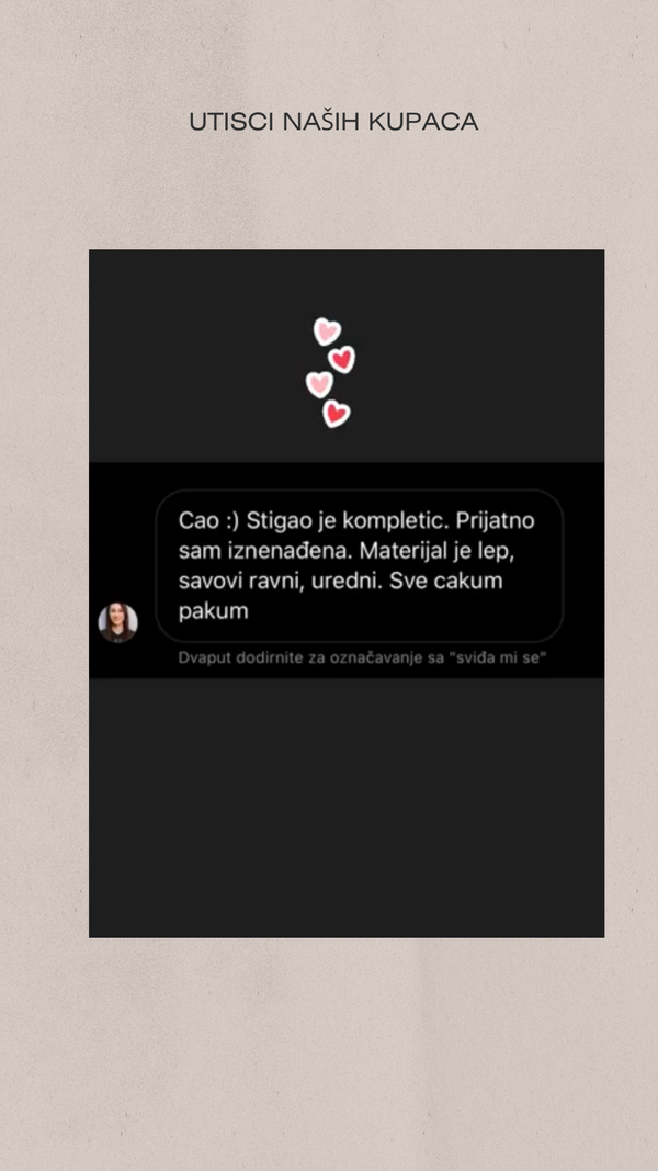 🏭 Važno je da znaš: Tia Lorens garderoba se ručno šije u Srbiji – bez masovne proizvodnje i bez uvoza. To znači da nosiš unikatni proizvod. Zbog pažljivog procesa šivenja, potrebno je do 7 dana da kreiramo model za tebe. Takođe, postoji mogućnost šivenja dužih nogavica, rukava i sličnih izmena / dodataka po potrebi. Za takav vid porudžbine molimo te piši na WhatsApp. Hvala ti na strpljenju i podršci domaćem brendu koji danas broji preko 10.000 zadovoljnih žena! 💕